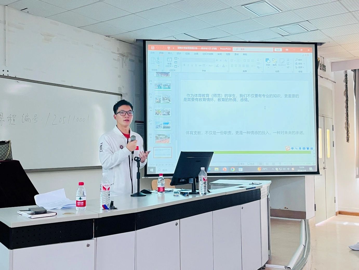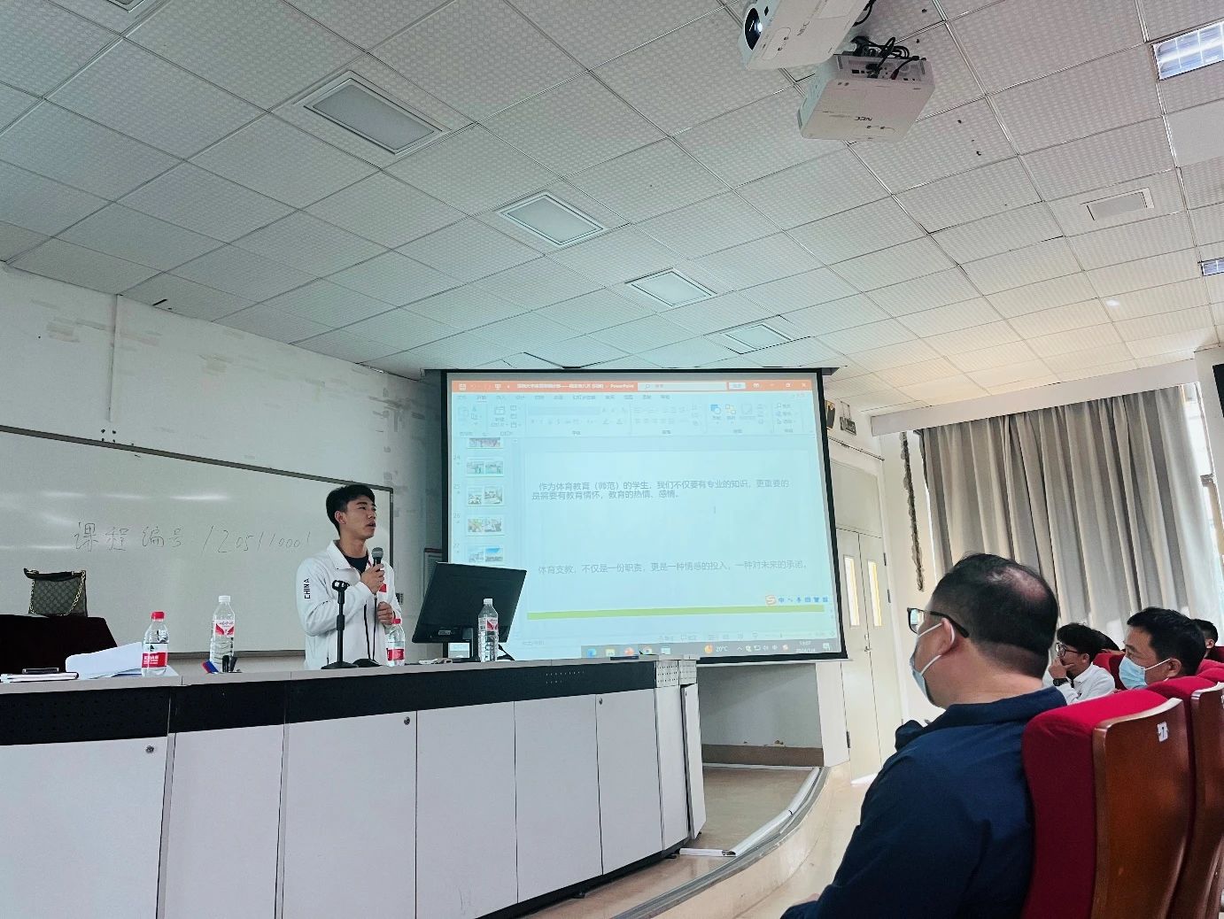 领导致辞之后,作为本次“体育浸润计划”的支教学生队长2021级体育教育系的洪逸凡同学对帮扶汕尾市陆丰八万学校的“体育浸润计划”进行了成果汇报,内容围绕体育课程体系建设、学术性研究、学生体质评估及提升、中考成绩提升、校运动队及武术大课间品牌建设等方面。洪逸凡同学代表整个支教团队为“体育浸润计划”交上了满意的答卷。其间,洪逸凡同学还分享了自己在支教过程中的点点滴滴,虽然只有短短3个月的时间,但支教的经历难忘且珍贵,尤其是和支教帮扶学校那边的师生建立起了浓厚的情谊,让人感动。