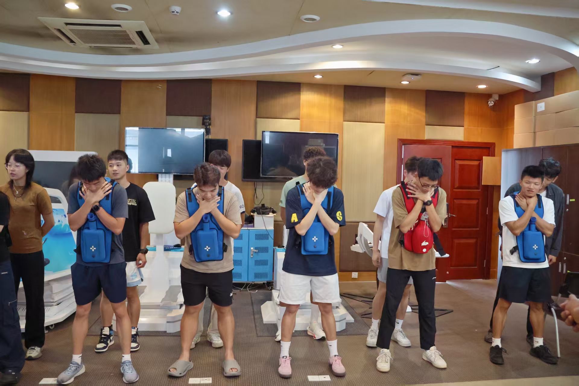 培训第一阶段聚焦“消防安全与个人防护”,教练不仅详细演示应急面罩、防护手套等装备的规范穿戴流程,并通过实物拆解,讲解不同类型灭火器的适用火灾场景、操作步骤及安全注意事项。随后,全体学员参与模拟灭火实操,在教练指导下反复练习 “提、拔、握、压” 动作;第二阶段转入“基础救援技术”教学,针对运动训练中常见的伤员转运需求,教练系统讲解基础理论,并组织学员分组开展伤员转运模拟演练,强化实操熟练度;最后阶段聚焦“医疗急救核心技能”,采用“理论讲解+示范教学+分组实操+纠错指导”的立体化模式。在心肺复苏与自动体外除颤器(AED)操作环节,教练先明确心脏骤停急救黄金4分钟的重要性,详解AED使用原理与操作步骤,再通过模拟人进行标准动作示范。学员分组实操时,教练逐人检查动作规范性,确保每位学员都能达到“流程完整、动作标准、处置高效”的要求。